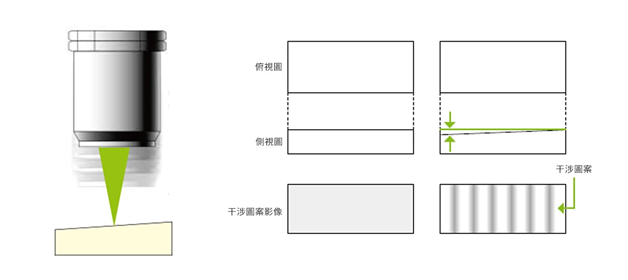 量測前,需要使用測角儀平臺對樣品進(jìn)行斜率校正。因為當(dāng)樣品傾斜時,干涉圖案會變得密集,將影響量測準(zhǔn)確性。