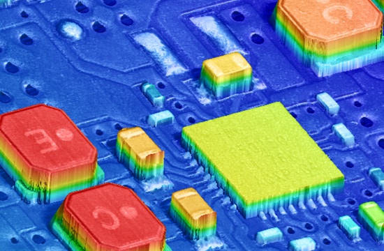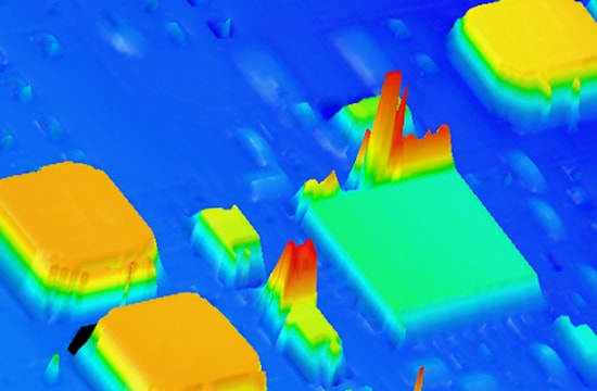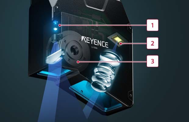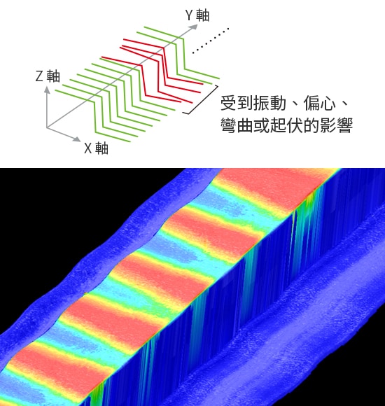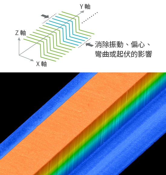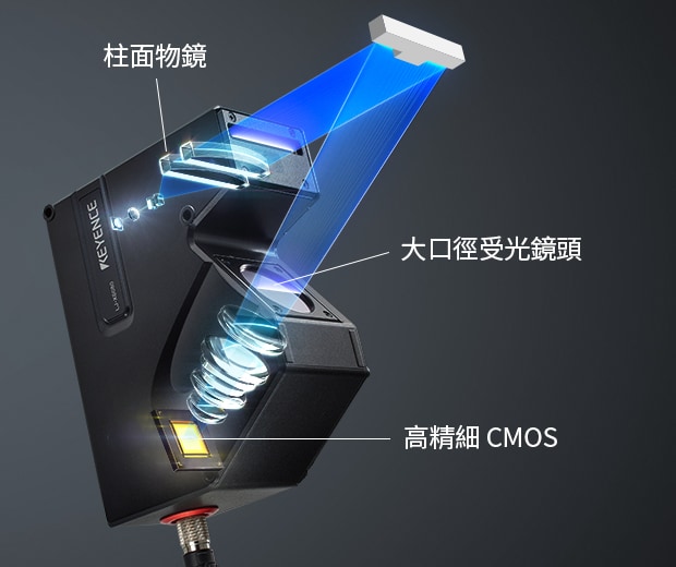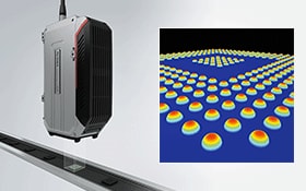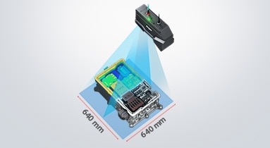 使用光切法的雷射位移計(jì)(2D、3D)。以線(xiàn)型雷射光照射目標(biāo)物表面,再以CMOS接收其反射光的變化,以非接觸形式量測(cè)高度、高低差、寬度、平面度等輪廓(截面形狀)。對(duì)連續(xù)取得之輪廓資料進(jìn)行影像處理,取得3D形狀,實(shí)現(xiàn)高精度量測(cè)與全檢。而且,KEYENCE的全新自動(dòng)掃描3D感測(cè)器能夠在短短零點(diǎn)幾秒內(nèi)對(duì)靜止目標(biāo)物進(jìn)行高精度的3D外觀檢查,使其能在更多情況下進(jìn)行檢查。