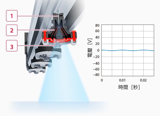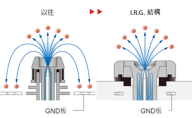 生成離子時不可或缺的GND板,過去皆安裝於外部,SJ-H系列則率先採用將其內(nèi)建於靜電消除器的「I.R.G.結(jié)構(gòu)」。藉由讓生成的離子毫無減損地往目標(biāo)物方向流動,而非流向GND板,使得流往目標(biāo)物的離子量增加,實現(xiàn)高達(dá)過去5倍的高速靜電消除。