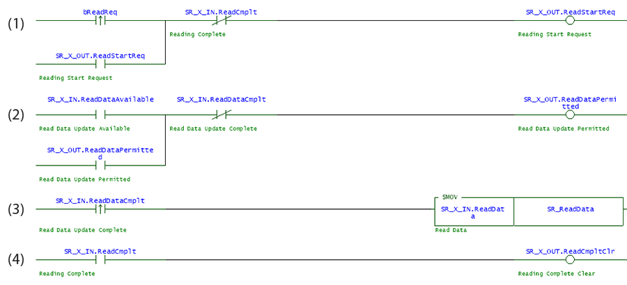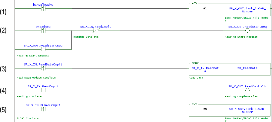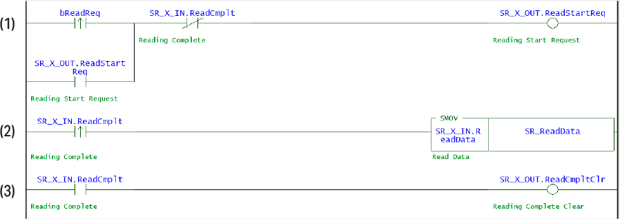 在此程式範(fàn)例中,使用下列 SR-X 系列 裝置指定,讀碼器會(huì)被指示以 1 號(hào)庫(kù)的設(shè)定開(kāi)始讀取,讀取字串會(huì)儲(chǔ)存在 SR_ReadData 中。